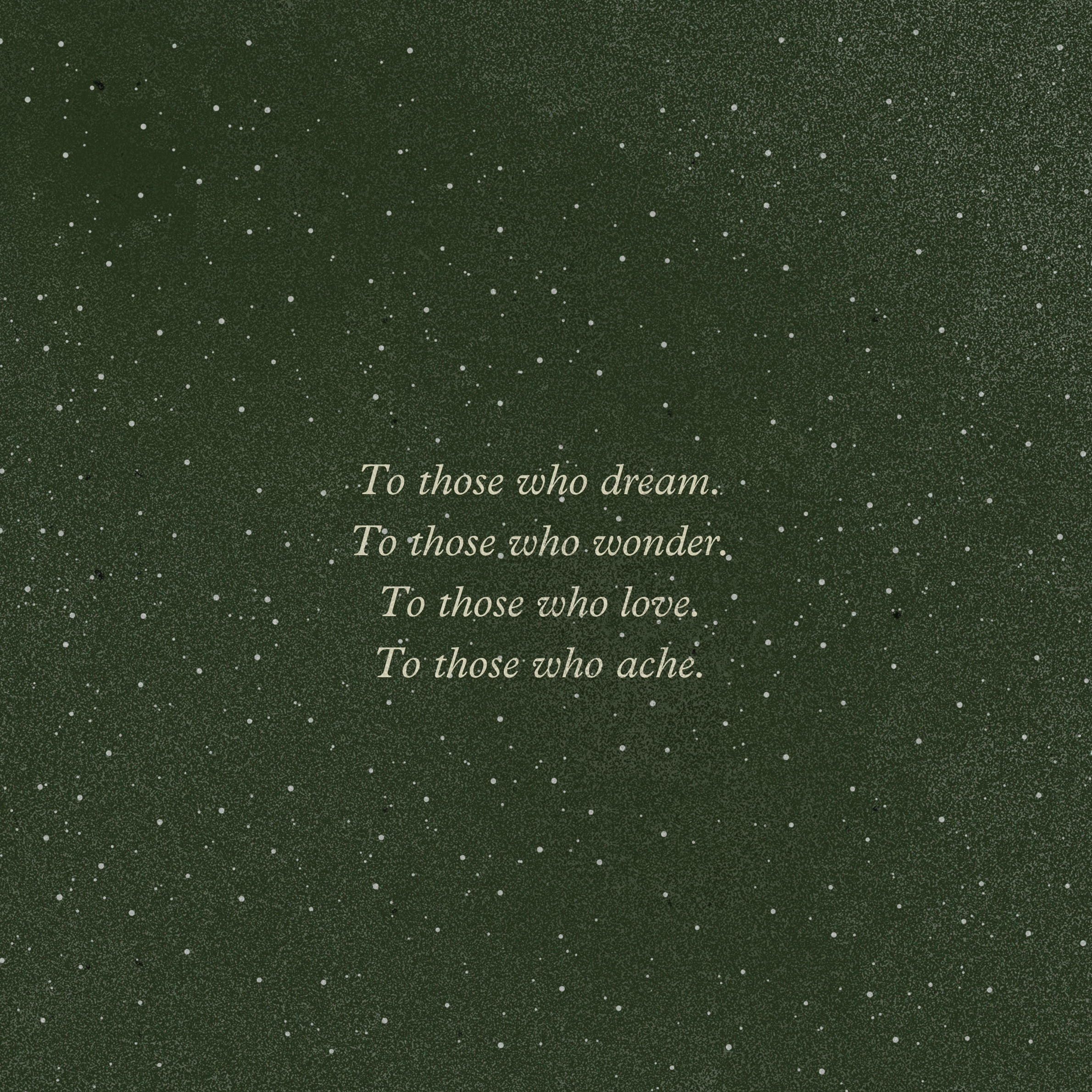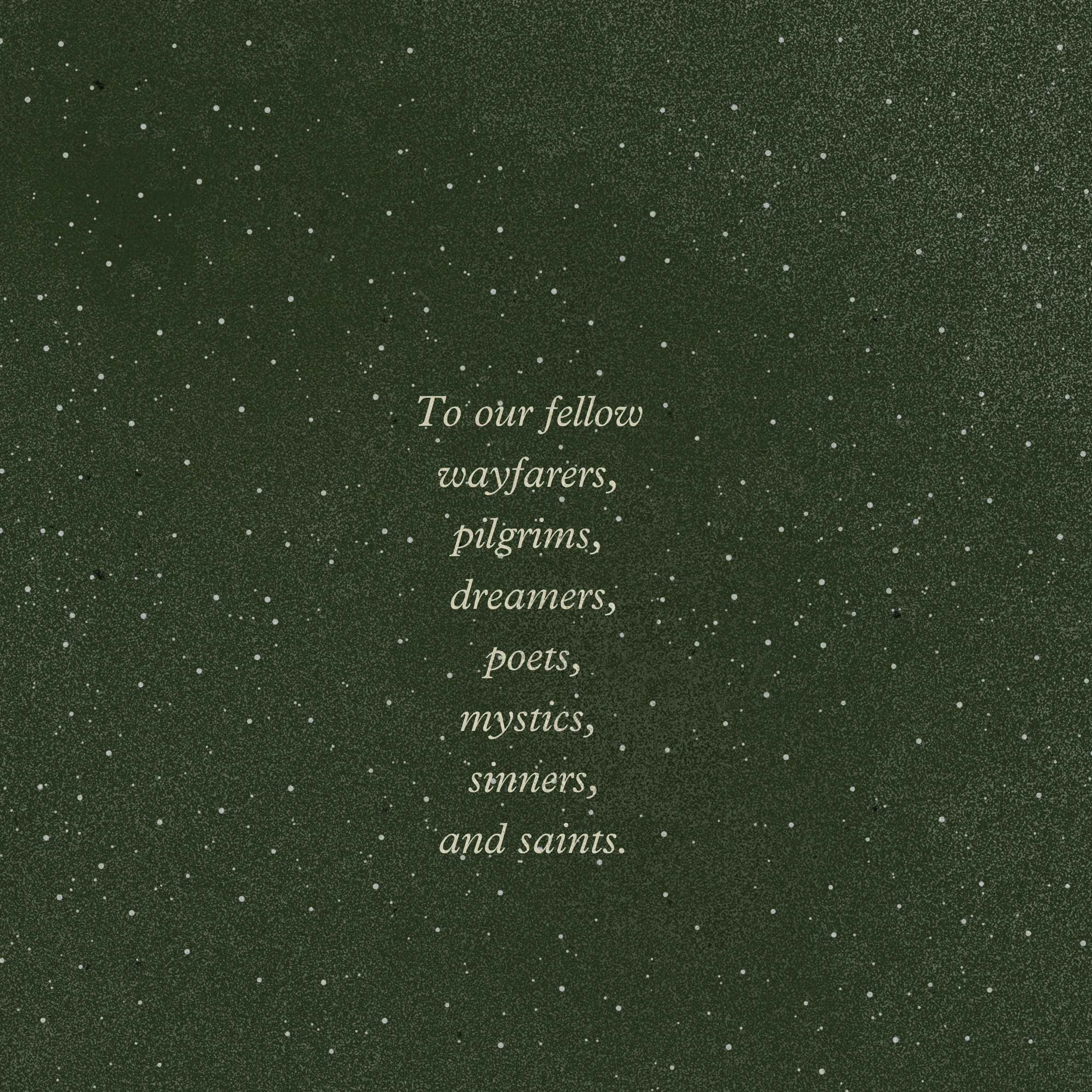 This is for the poets, the dreamers, and the deep beautiful feelers. To all who have cried at a sunset, or a beautiful song. To those whose hearts burn with wonder, and who have stood speechless with awe. This is for those who love and ache a little like us in this world. Those who who like us are on Homeward road.